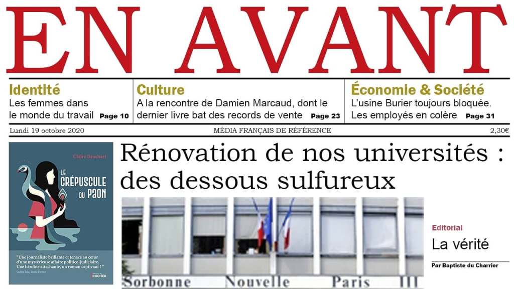 « En Avant » a sa une! Anne Burzynski, que les internautes connaissent bien grâce à sa chaîne YouTube « Les Etats d’Anne », a imaginé la première page de l’hebdomadaire pour lequel travaille, Pascaline Elbert, l’héroïne de mon troisième roman, « Le Crépuscule du Paon » (éditions du Rocher). Anne m’a également fait l’honneur d’y consacrer une vidéo! Dès la fin du confinement, partez à la rencontre de cette jeune femme dynamique et passionnée, qui travaille à la Librairie L’Ecriture de Vaucresson (membre du réseau Libraires en Seine).